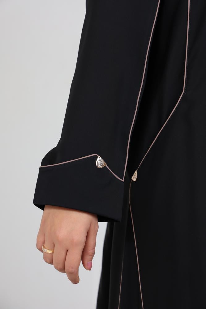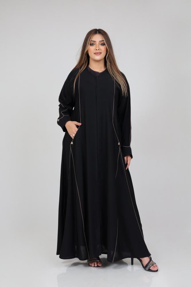 عباية تجمع بين الأناقة والفخامة بتفاصيل تركيبات متقنة على الأكمام والأطراف، تمنحها طابعًا عصريًا راقيًا يعكس ذوقًا مميزًا وشخصية واثقة. التصميم الانسيابي يضفي لمسة من الجمال الهادئ والفخامة البسيطة.