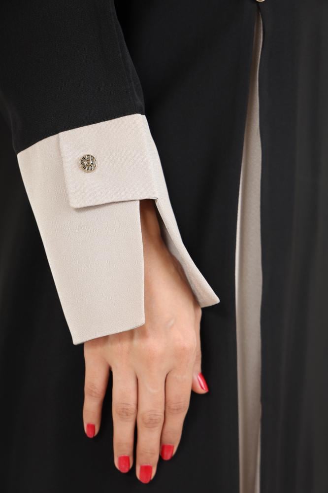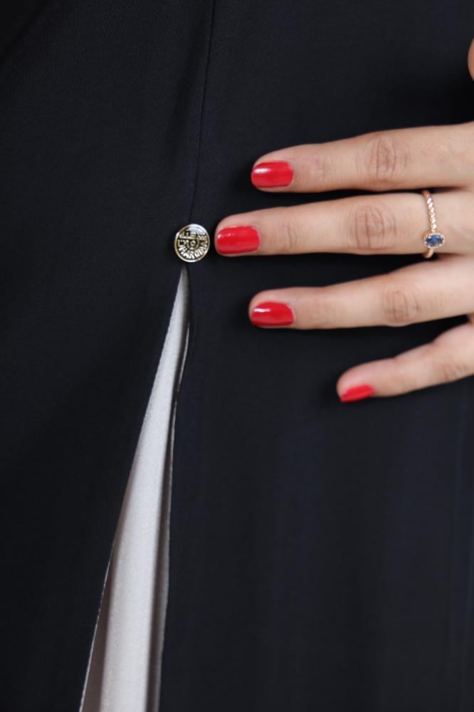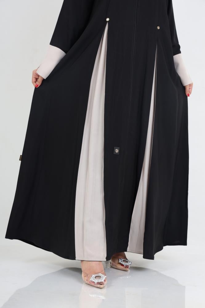 التصميم يتضمن كسرتين أماميتين تضيفان لمسة من الديناميكية والأنوثة. هذه الكسرتان تساعدان في تسهيل الحركة وتمنحان العباية شكلًا فريدًا وجذابًا.