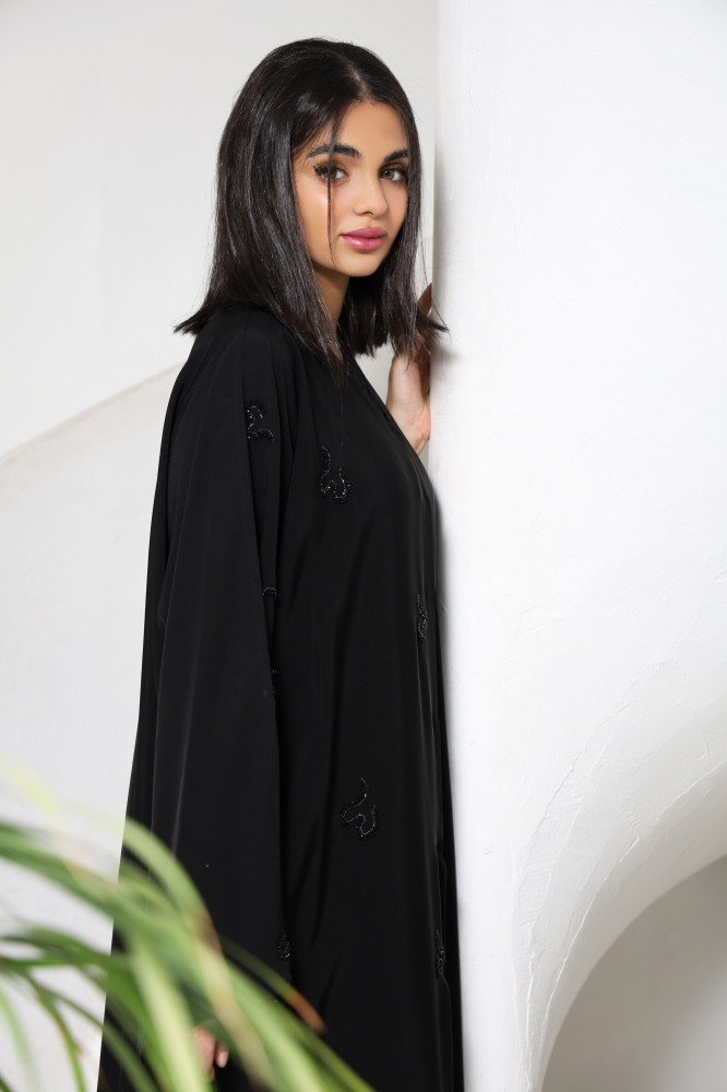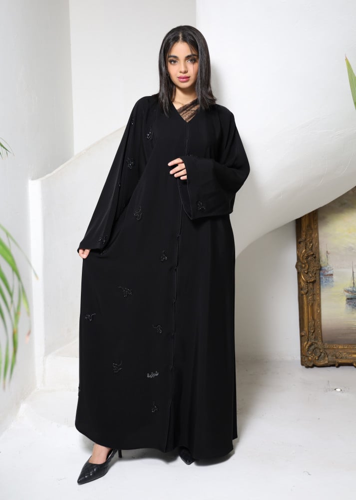 عباية قماش صالونا موديل كردانة تصميم خرز على شكل قلوب منثرة طول العباية من الامام بتطريقة أنيقة ومميزة تتوفر بعدة مقاسات مختلفة مع طرحة مقاس عرض 28 أنش