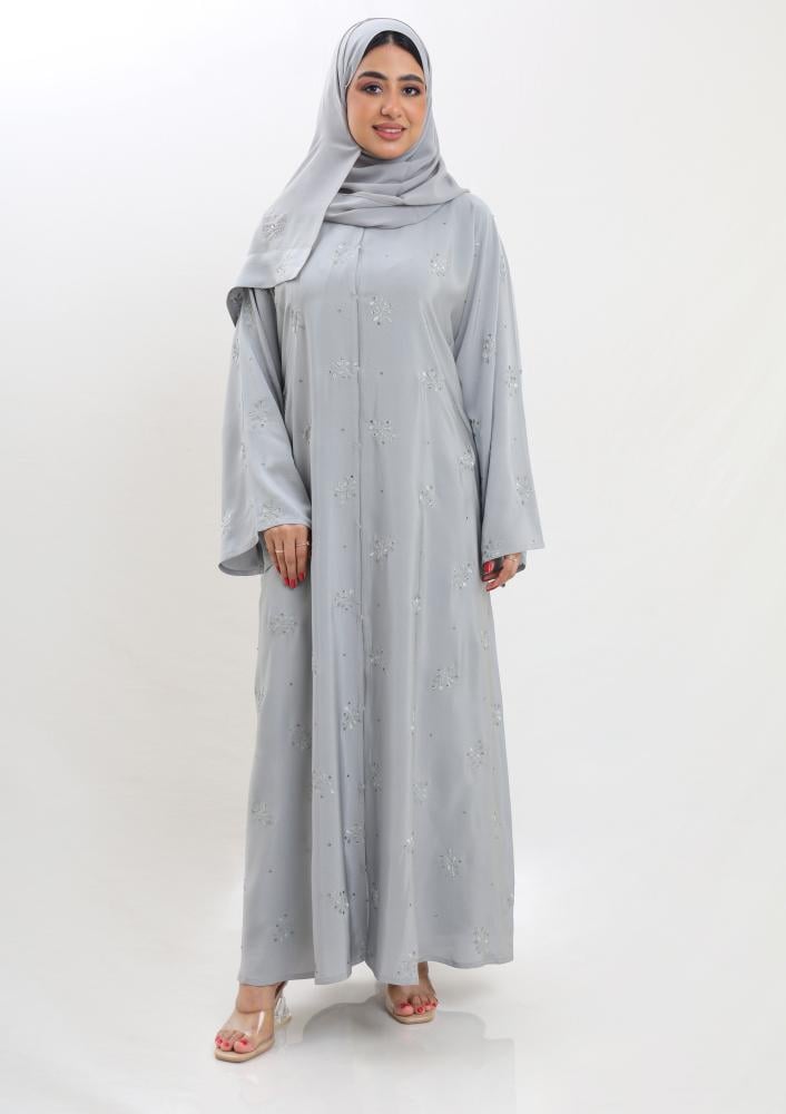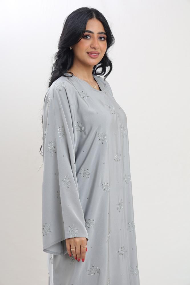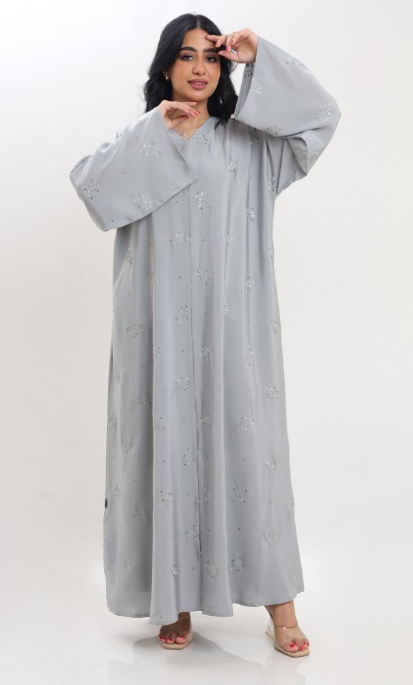 تتميز العباية بتفاصيل دقيقة ورائعة من التطريز بالكريستال سوارفسكي على كامل العباية، مما يضفي لمعانًا رائعًا وتألقًا استثنائيًا على العباية. يعتبر الكريستال سوارفسكي معروفًا بجودته العالية وبريقه الفريد، وهو يعزز جمال العباية ويجعلها تبدو ساحرة وراقية.