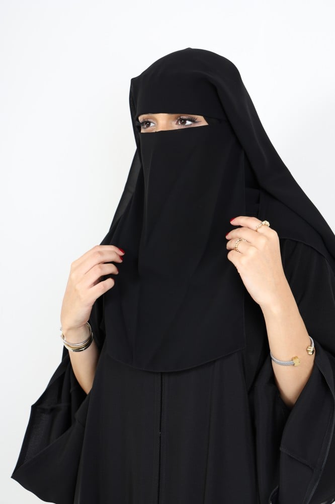 مطابق لمواصفات النقاب الإسلامي فلا يشف ولا يظهر أي جزء من الوجه إلا العينين لوجود طبقة مزدوجة لضمان عدم شفافيتها.