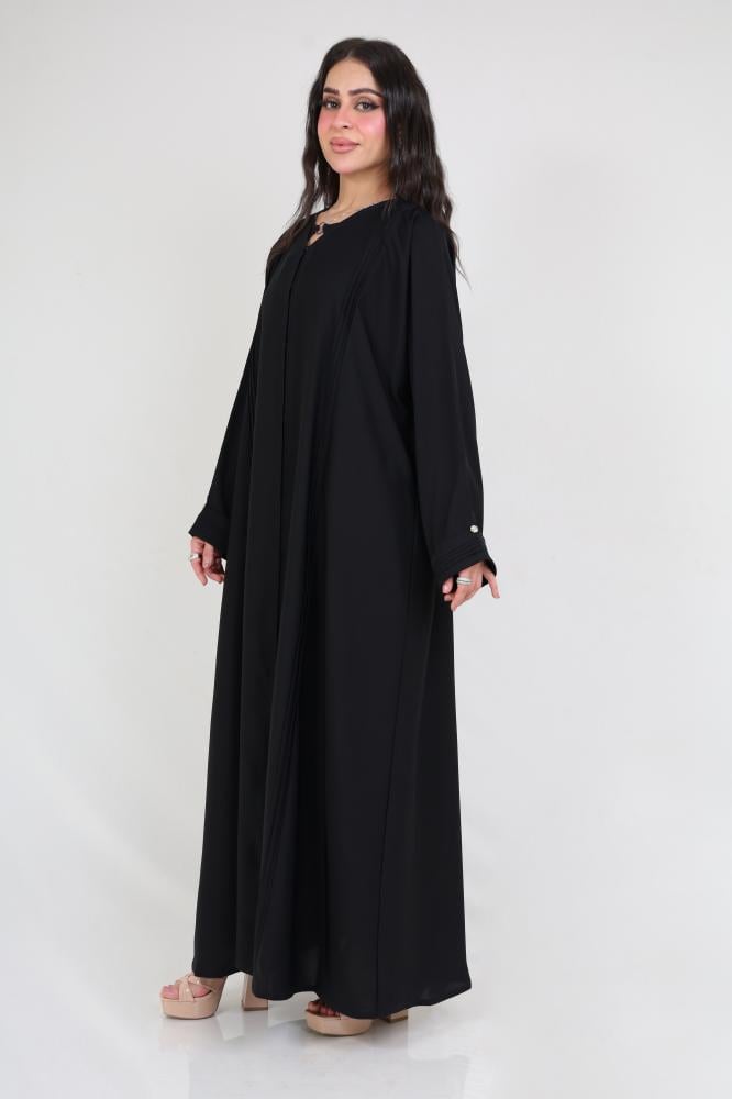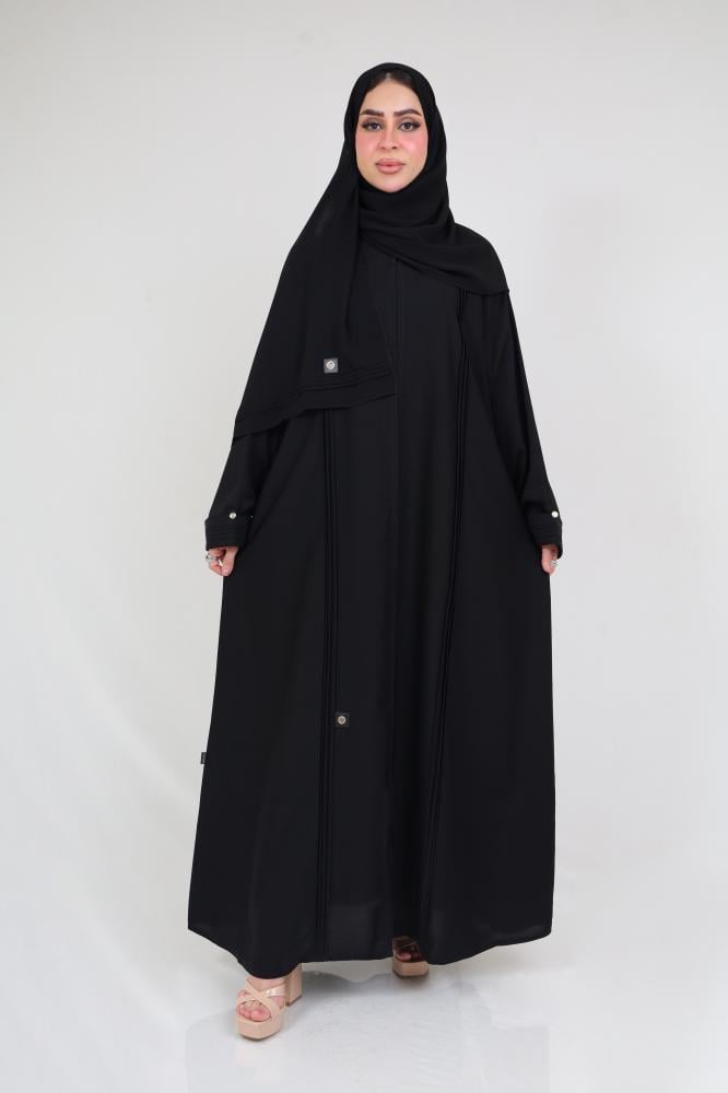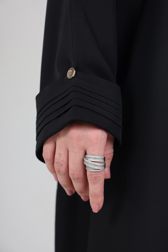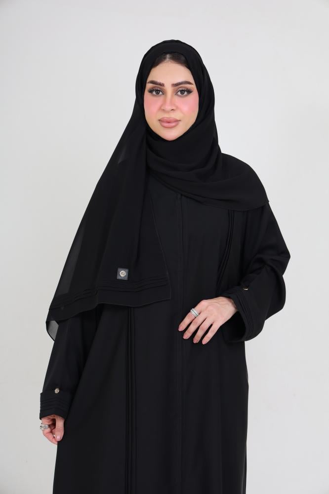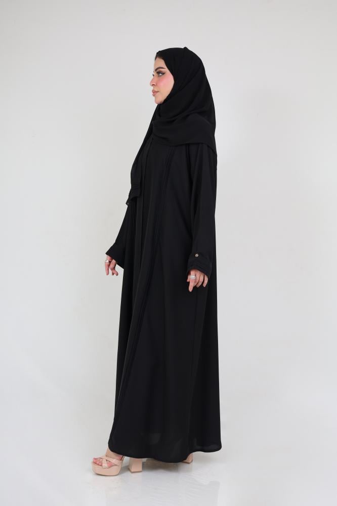 Khetam abaya features stunning model details adding a special charm to the design. The front and sleeves ruffles enhance the elegance and uniqueness of the abaya. These ruffles impart a sense of individuality and beauty to the design, making it a distinctive and one-of-a-kind piece.